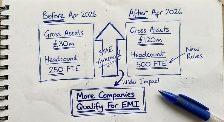 From 6 April 2026, the Finance Bill 2025-26 changes expand EMI eligibility materially. The gross assets limit increases from £30 million to £120 million, and the employee headcount limit rises from 250 to 500 full-time equivalents. This brings a significantly larger pool of VC-backed scale-ups into the scheme, and we expect SAV's workload to increase as a result.