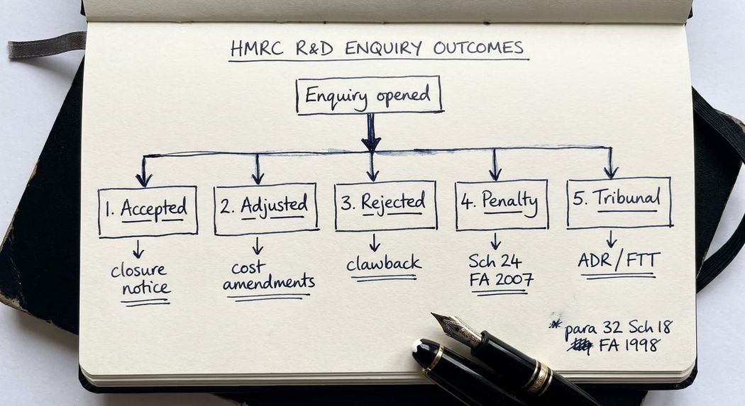Typical HMRC R&D enquiry outcomes are (1) acceptance of the claim as filed, (2) acceptance with specific cost adjustments, (3) material reduction or full rejection on the basis that the claim fails the qualifying activity or expenditure tests, (4) rejection combined with a Schedule 24 FA 2007 penalty, and (5) escalation to statutory review, Alternative Dispute Resolution or the First-tier Tribunal.