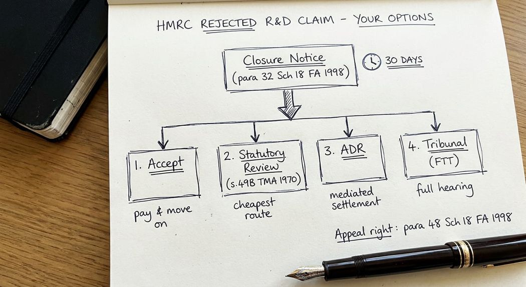 If HMRC has rejected your R&D tax credit claim, four options remain open. You can accept the closure notice and pay any liability. You can request a statutory review under s.49B TMA 1970. You can apply for Alternative Dispute Resolution. Or you can appeal to the First-tier Tribunal (Tax Chamber). Each has its own deadlines, costs, and merits. The right route depends on why HMRC rejected the claim, the strength of the evidence you can now produce, and the commercial exposure on the file. In my experience, the decision needs to be made within days of the closure notice landing, not weeks.