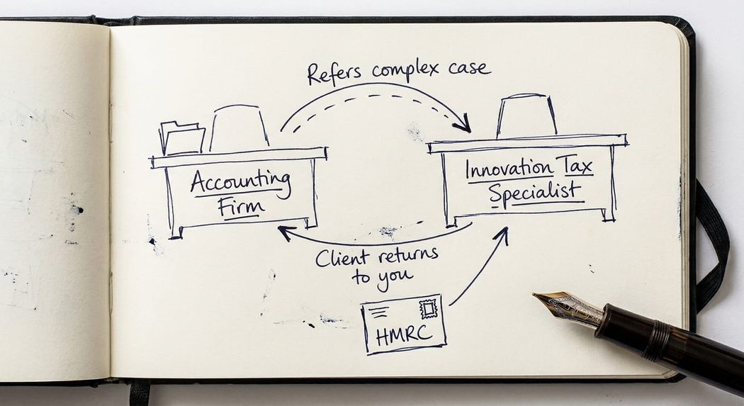 Most accounting firms will encounter at least one innovation tax problem each year that sits beyond their in-house capability. An HMRC enquiry into a significant R&D claim, a SEIS structure with connected persons complications, a Patent Box computation for a manufacturing group, an EMI scheme where disqualifying events have occurred. In those cases, the best outcome for everyone (the firm, the client, and the adviser) comes from referring the work to a specialist. Here is how innovation tax referral arrangements work in practice.