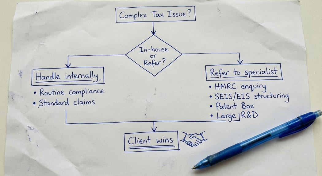 Accountants are the gateway to innovation tax work. You see the clients, you prepare the accounts, you file the returns. But you are not specialists in R&D defence, SEIS/EIS structuring, or Patent Box computation. Nor should you be; it is not your practice.